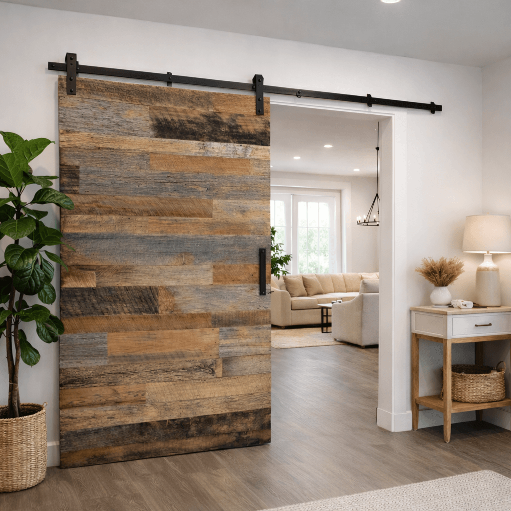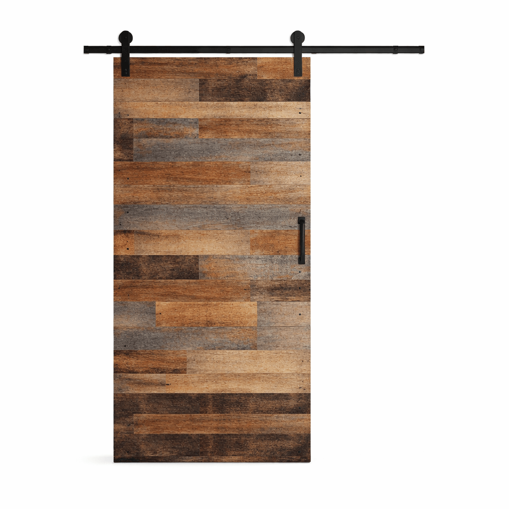 The Axen Rustic Barn Door from Your Barn Door Guys brings authentic character and raw texture into your home through its reclaimed wood construction and layered plank design. Each door showcases natural variations in tone and grain, creating a one-of-a-kind rustic statement that adds depth and warmth to any space.